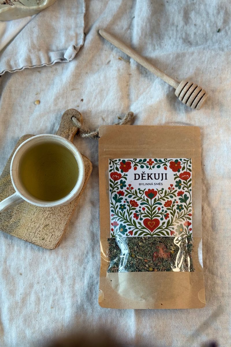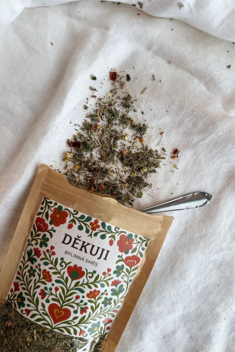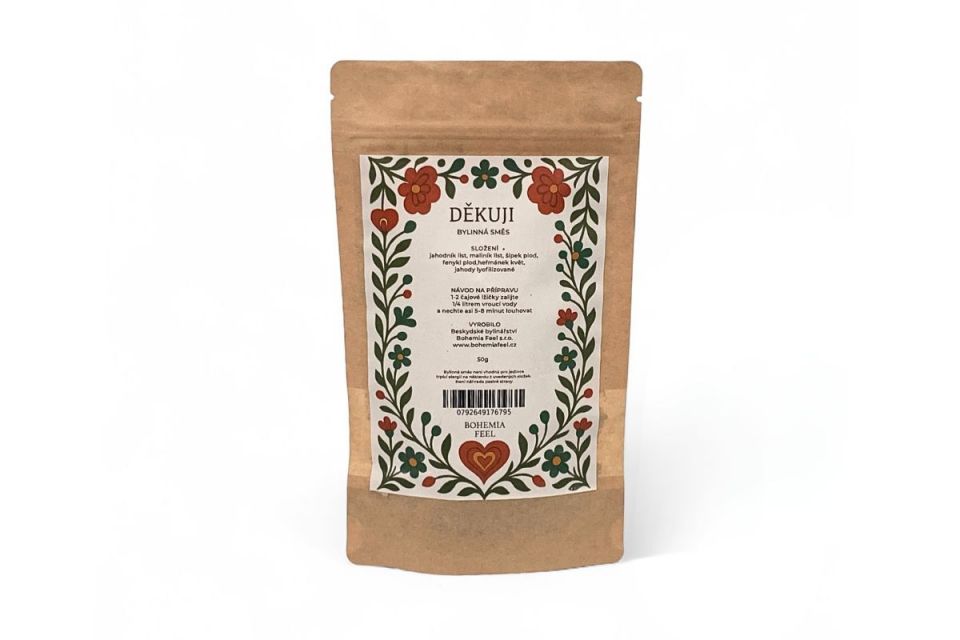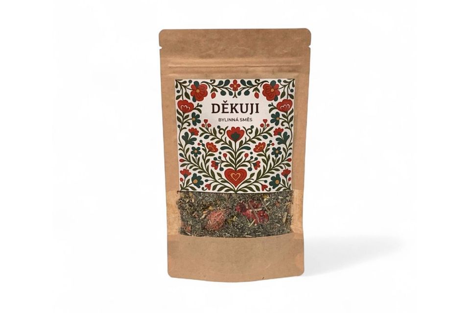 Čaj Ďakujem je bylinkový čaj vytvorený ako malé poďakovanie – od srdca, z lásky a s úctou k ľuďom, ktorí nás sprevádzajú. Jemné byliny, ktoré by starostlivo vyberali aj starí bylinkári, tvoria harmonickú zmes vhodnú na chvíle pokoja, zdieľania a vďačnosti. Jemne ovocná vôňa jahôd a malín sa spája s hebkou chuťou harmančeka a prirodzenou sladkosťou šípku.