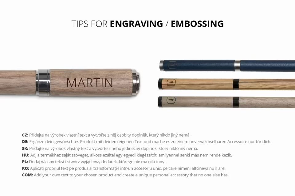 Osobitosť a jedinečnosť pera zdôrazníte vyrytím monogramu alebo textu. Maximálne je možné pridať 8 znakov. Ukážte, že drevené pero je práve vašou súčasťou. Text bude umiestnený na prednej strane dreveného pera.
