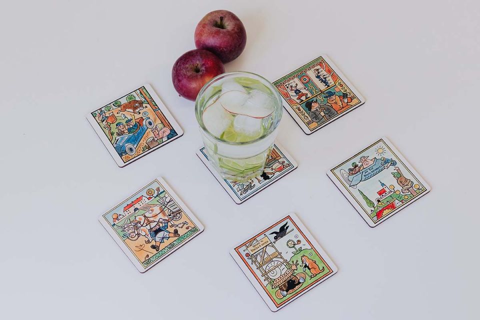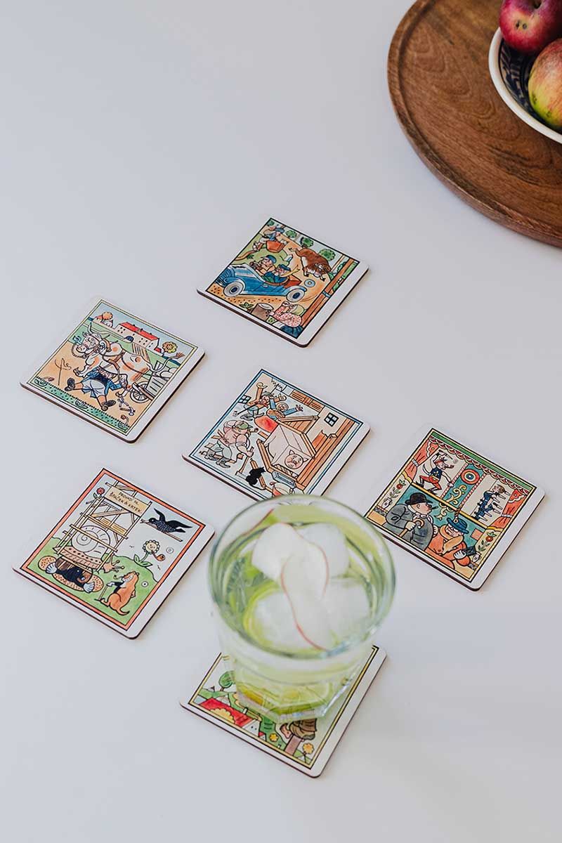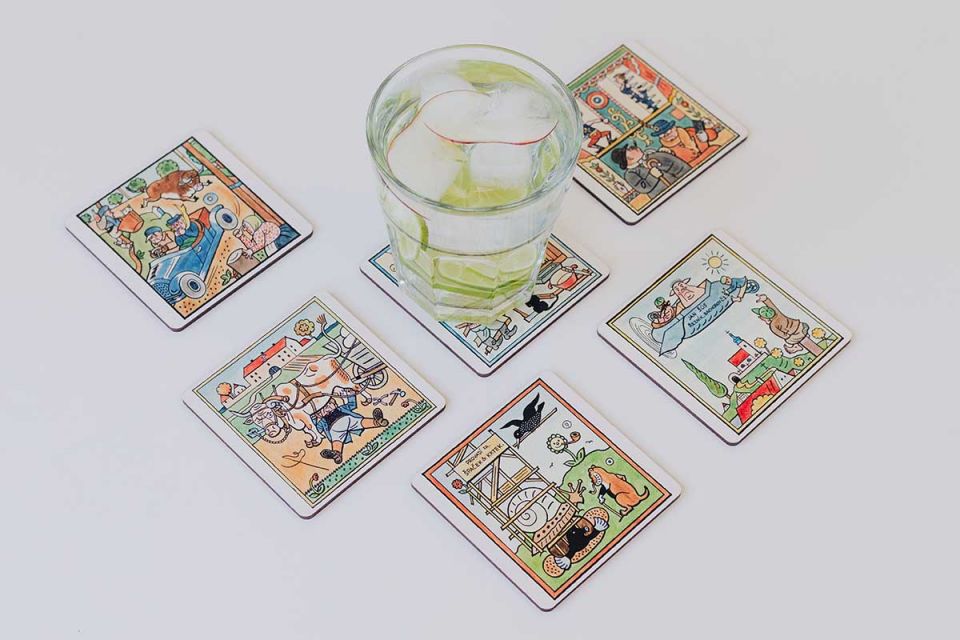 Veselé podložky pod poháre oživujú stôl farebnými scénkami zo života českého vidieka. Josef Lada majstrovsky zachytil každodenné radosti, postavy aj okamihy, ktoré v sebe nesú poéziu aj humor. Táto súprava prináša nielen ochranu pre váš stôl, ale aj úsmev do každej chvíle pri káve či čaji.