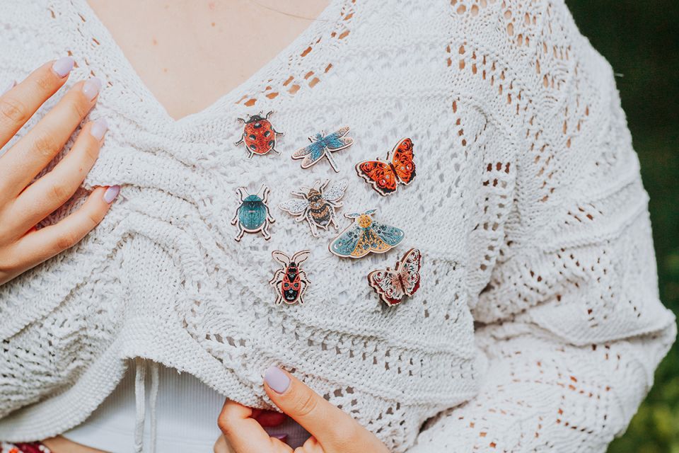 Prineste do svojho outfitu kúsok prírody s našimi drevenými brošňami. Aj ak si vyberiete modrú vážku, včelu, nočného motýľa, červeného motýľa, ružového motýľa, chrobáka, cifrušu alebo lienku, naše brošne dodajú vášmu vzhľadu unikátny a štýlový akcent. Ideálny pre milovníkov prírody a ručnej práce, naše drevené brošne sú perfektné ako darček alebo osobný šperk. Nechajte vyniknúť jemnosť a krásu prírodných motívov dreveným doplnkom.